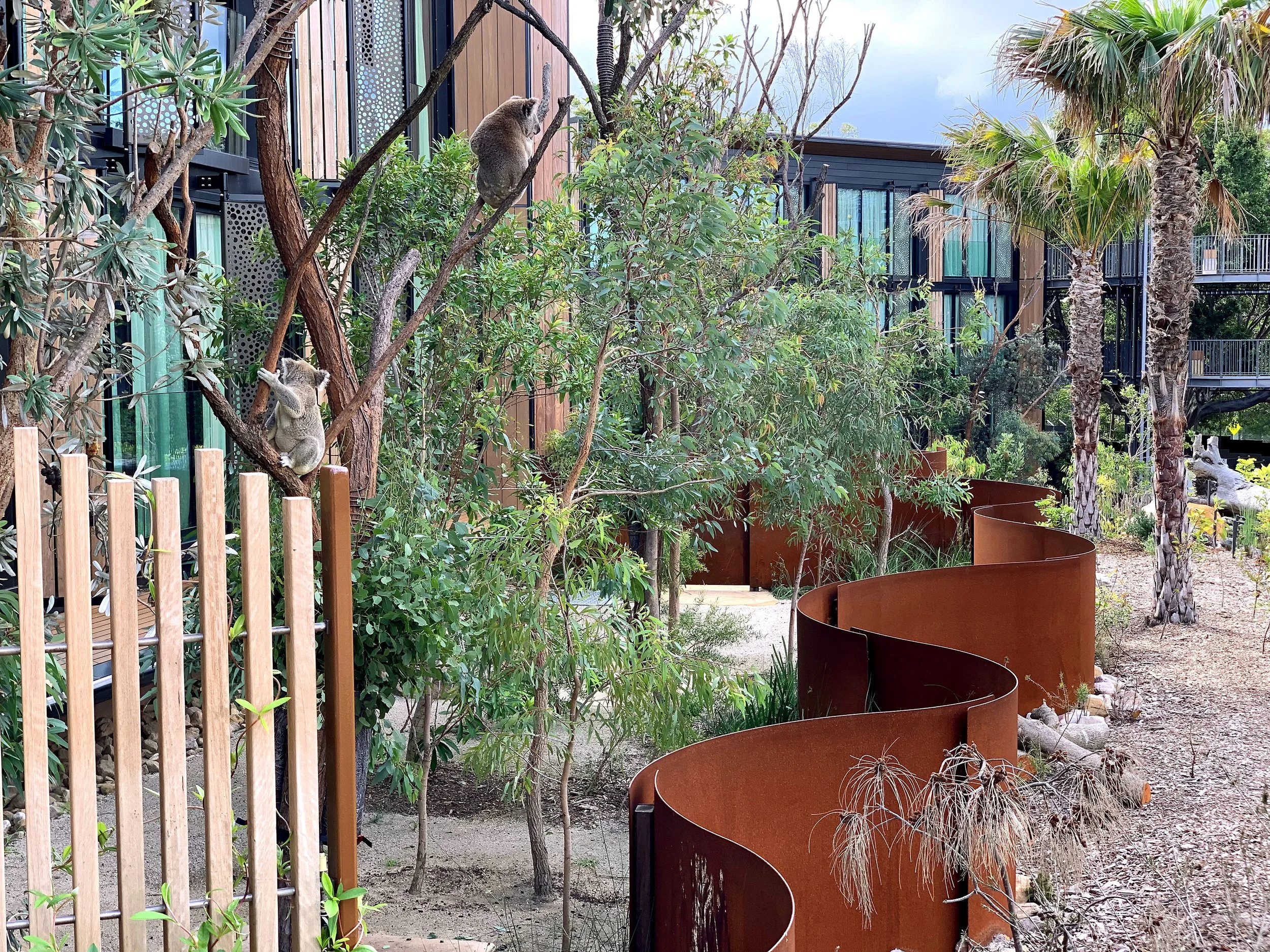 Our design was developed with Green and Dale Landscape Architects and Cox Architects, and is set within a series of five, 2-4 storey, 62 guest accommodation pods. Exhibit spaces offer interaction with a range of native animals including wallabies, echidnas, bandicoots, platypus, koalas and freshwater eels.