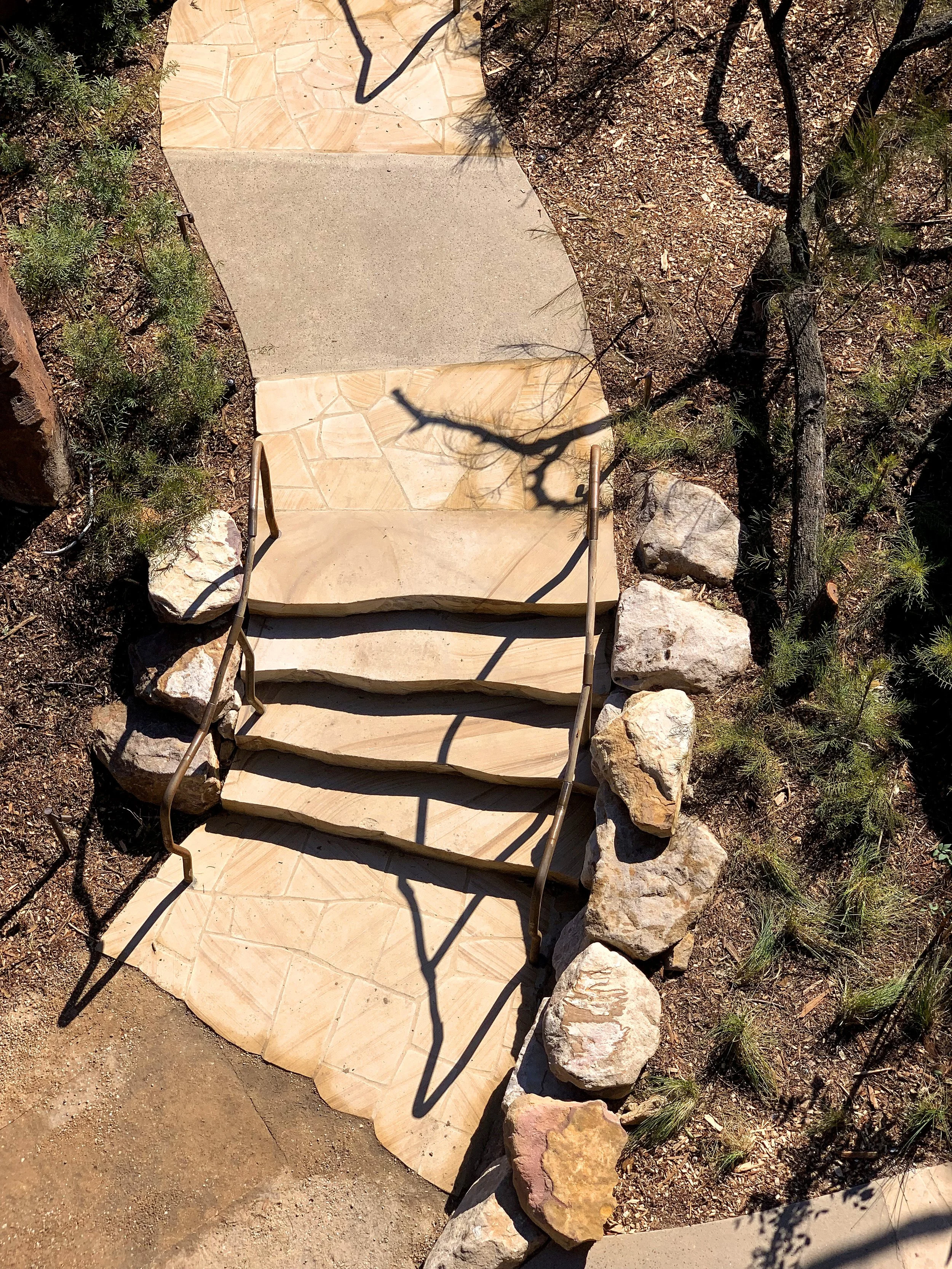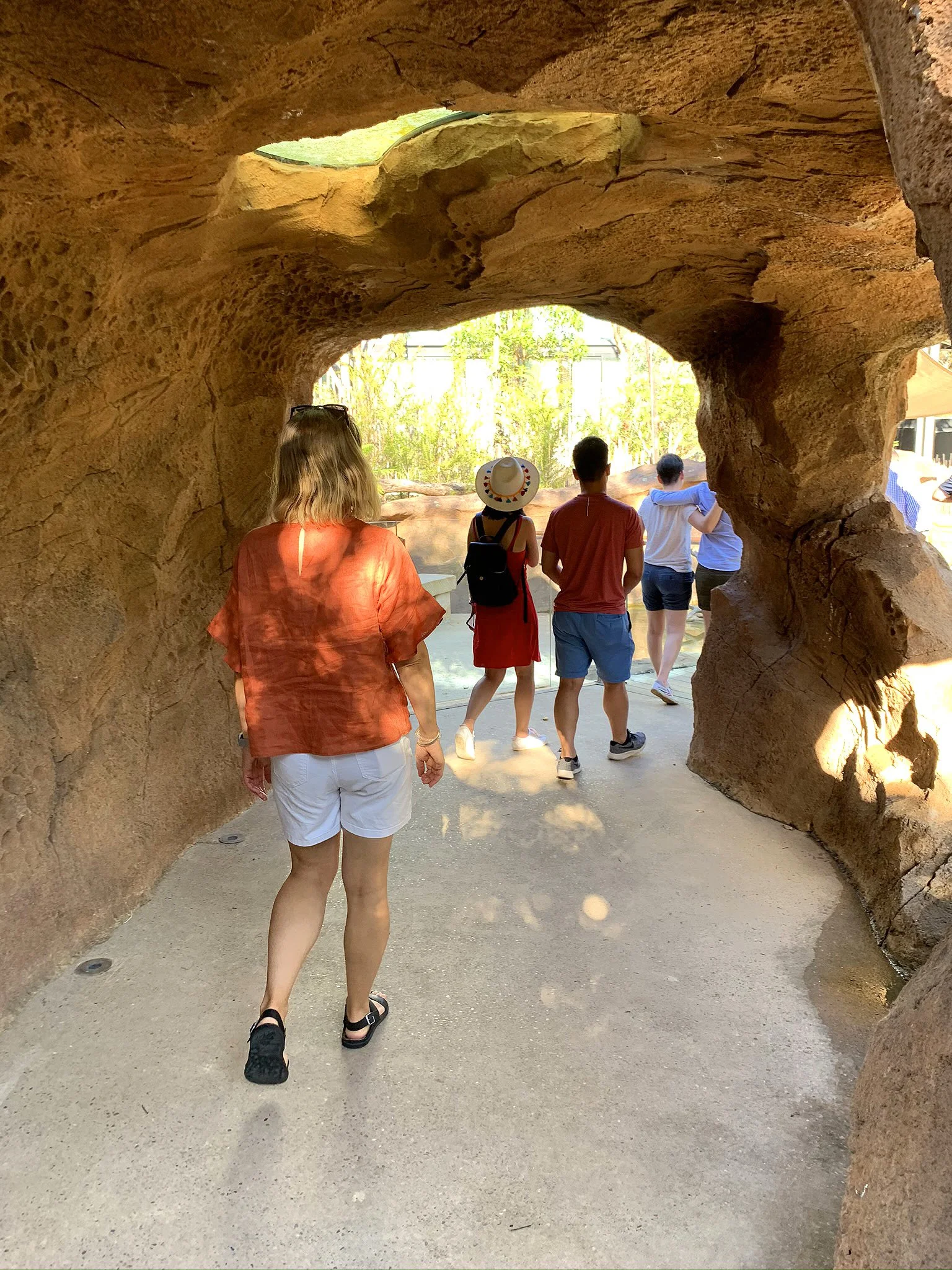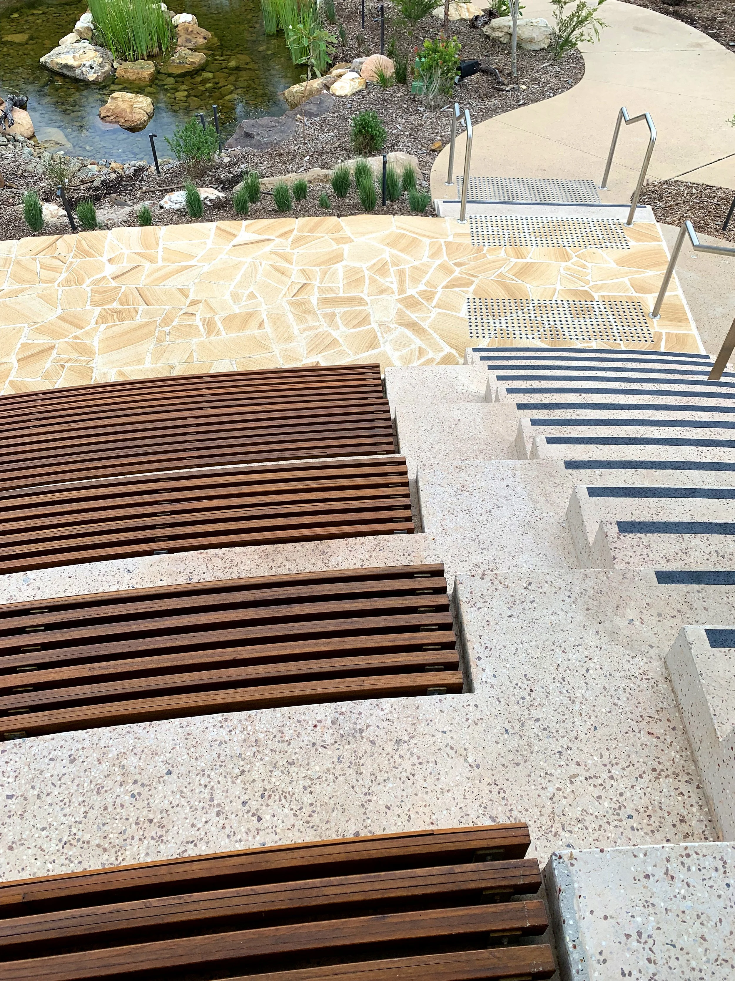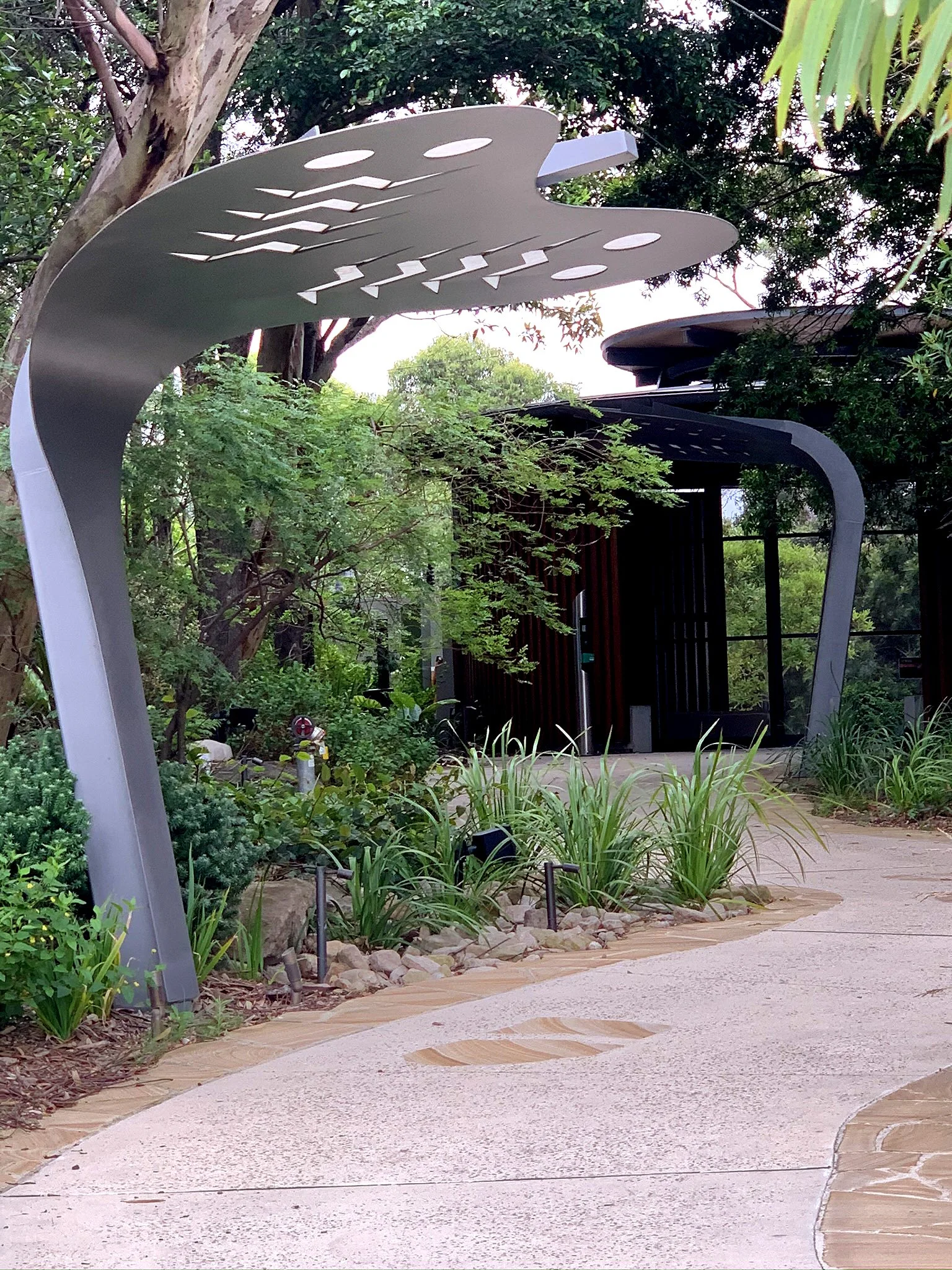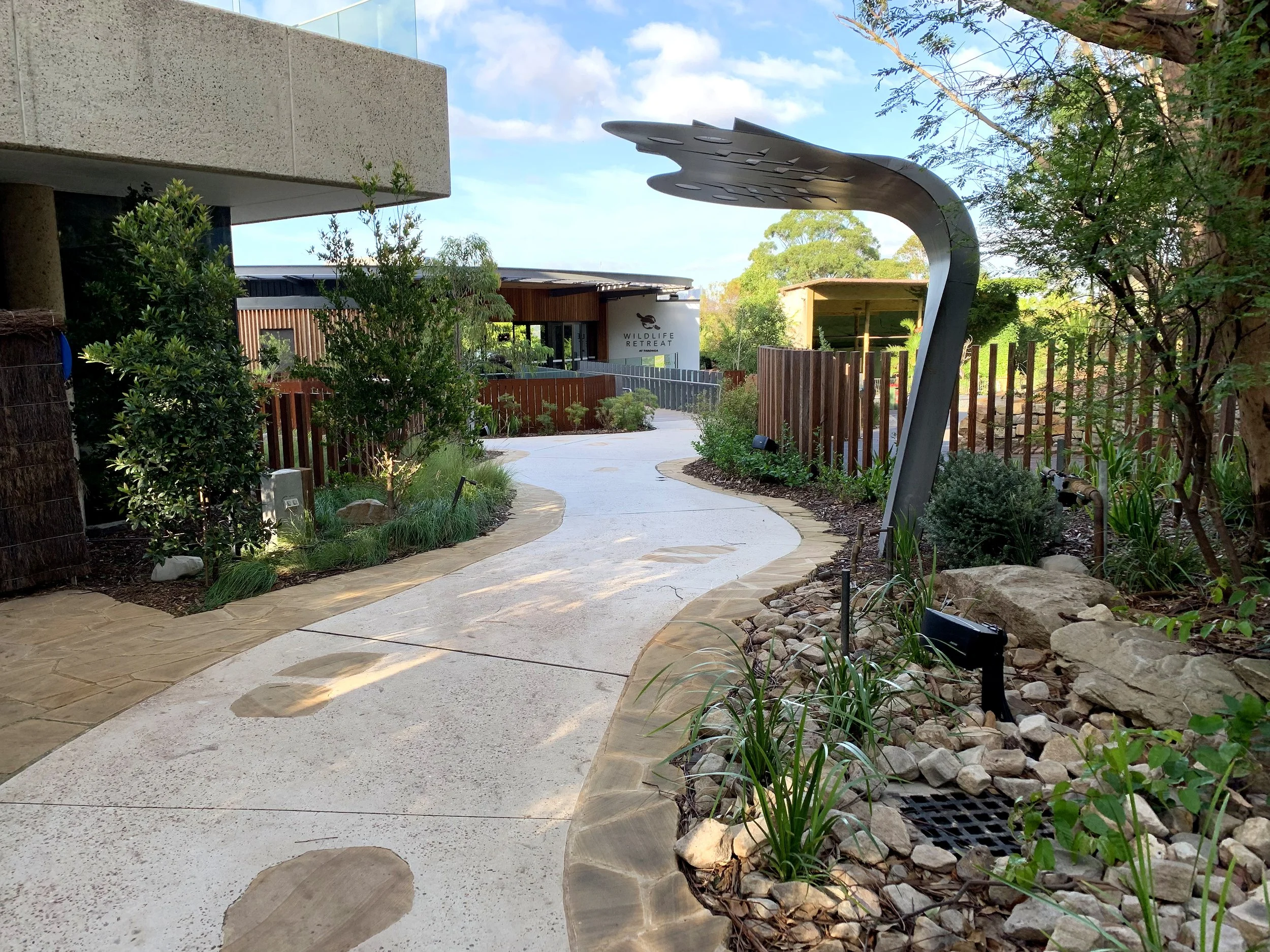 The design mimics a natural 'bushwalk' setting which winds along a cascading creek line and through a 4m waterfall with opportunity to engage with animals or relax at custom seating locations.